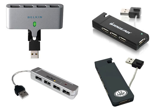 Four of particular interest include the Belkin Swivel Hub, IOGear MicroHub, Gear Head Integrated Hub, and StarTech Mini Hub.