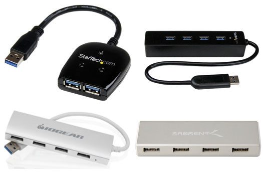 Four small USB 3.0 hubs of potential interest include two port and four port options from StarTech as well as four port options from IOGear and Sabrent.